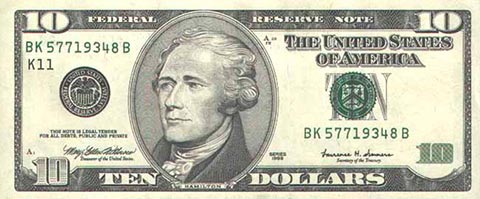 Доллар США. Купюра номиналом в 10 USD, аверс.