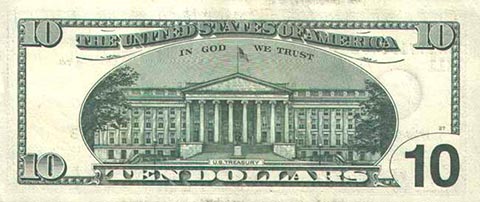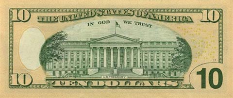 Доллар США. Купюра номиналом в 10 USD, реверс.