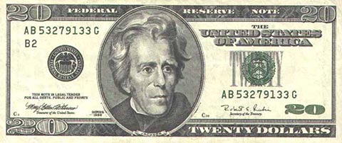 Доллар США. Купюра номиналом в 20 USD, аверс.