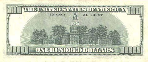 Доллар США. Купюра номиналом в 100 USD, реверс.