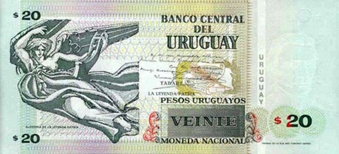 Уругвайские песо. Купюра номиналом в 20 UYU, реверс.