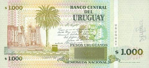 Уругвайские песо. Купюра номиналом в 1000 UYU, реверс.