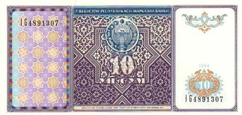 Узбекский сум. Купюра номиналом в 10 UZS, аверс.