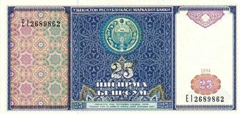 Узбекский сум. Купюра номиналом в 25 UZS, аверс.