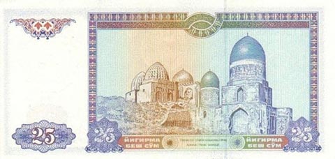 Узбекский сум. Купюра номиналом в 25 UZS, реверс.