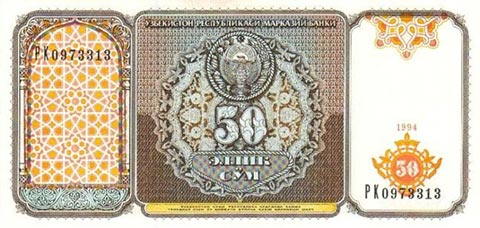 Узбекский сум. Купюра номиналом в 50 UZS, аверс.