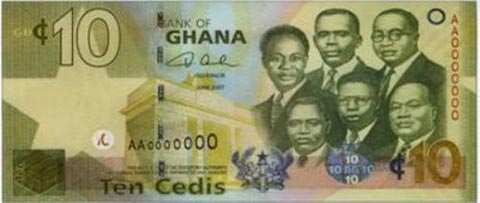 Ганский седи. Купюра номиналом в 10 GHS, аверс.