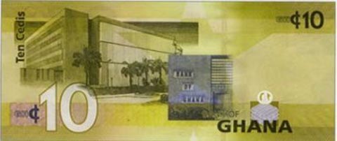 Ганский седи. Купюра номиналом в 10 GHS, реверс.