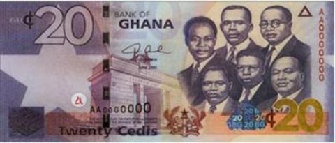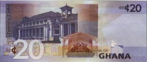 Ганский седи. Купюра номиналом в 20 GHS, реверс.