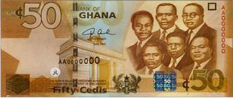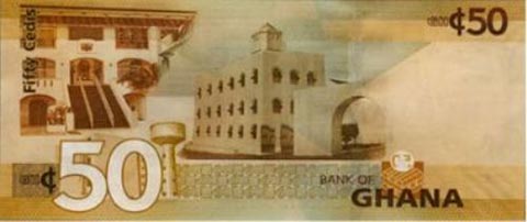 Ганский седи. Купюра номиналом в 50 GHS, реверс.