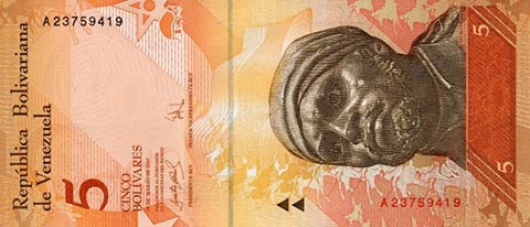ВенесуэльБоливар Фуэрте. Купюра номиналом в 5 VEF, аверс.