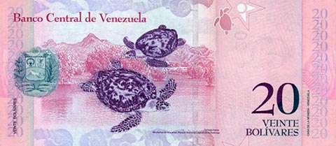 ВенесуэльБоливар Фуэрте. Купюра номиналом в 20 VEF, реверс.