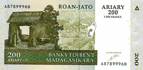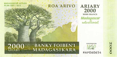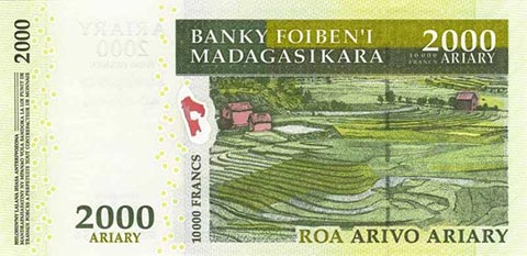 Малагасийский ариари. Купюра номиналом в 2000 MGA, реверс.