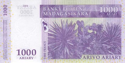 Малагасийский ариари. Купюра номиналом в 1000 MGA, реверс.