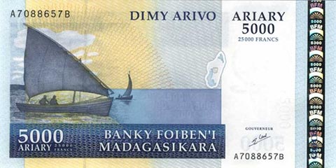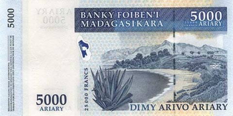 Малагасийский ариари. Купюра номиналом в 5000 MGA, реверс.