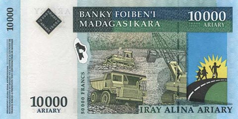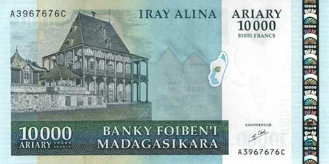Малагасийский ариари. Купюра номиналом в 10000 MGA, реверс.