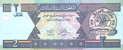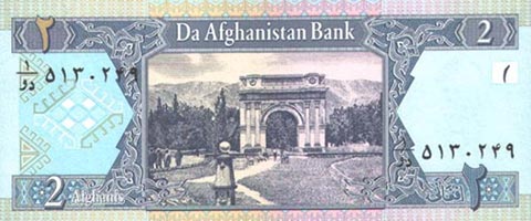 Афганский афгани. Купюра номиналом в 2 AFN, реверс.
