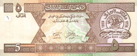 Афганский афгани. Купюра номиналом в 5 AFN, аверс.