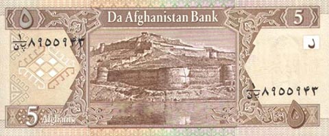 Афганский афгани. Купюра номиналом в 5 AFN, реверс.