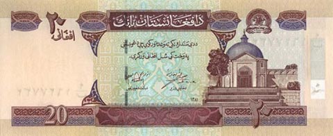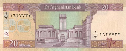 Афганский афгани. Купюра номиналом в 20 AFN, реверс.