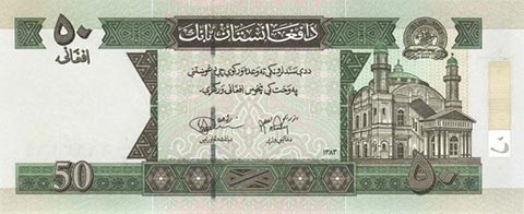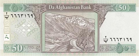Афганский афгани. Купюра номиналом в 50 AFN, реверс.