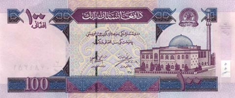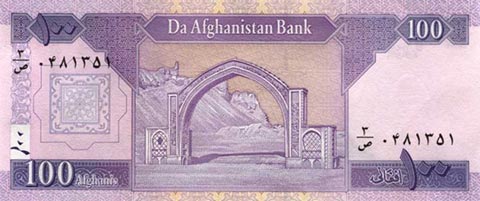Афганский афгани. Купюра номиналом в 100 AFN, реверс.