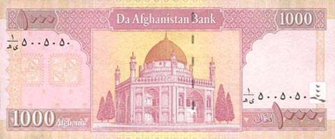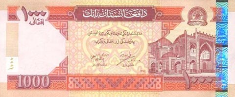Афганский афгани. Купюра номиналом в 1000 AFN, реверс.