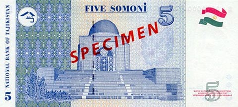 Таджикский сомони. Купюра номиналом в 5 TJS, реверс.