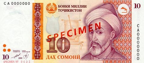 Таджикский сомони. Купюра номиналом в 10 TJS, аверс.