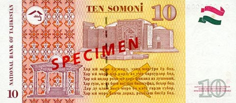 Таджикский сомони. Купюра номиналом в 10 TJS, реверс.
