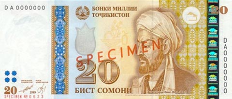 Таджикский сомони. Купюра номиналом в 20 TJS, аверс.