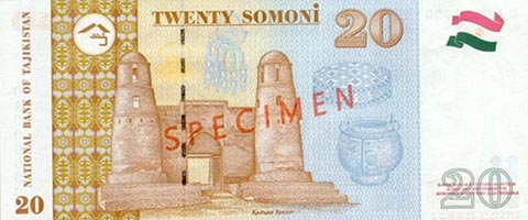 Таджикский сомони. Купюра номиналом в 20 TJS, реверс.