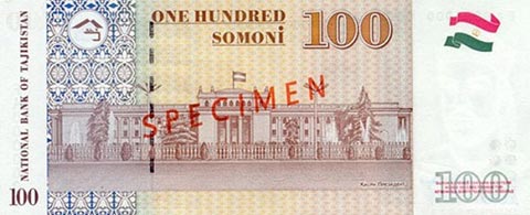 Таджикский сомони. Купюра номиналом в 100 TJS, реверс.