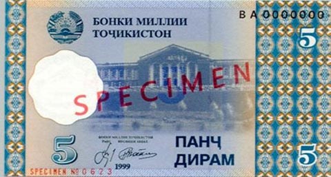 Таджикский сомони. Купюра номиналом в 5 Deram, аверс.