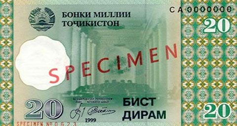Таджикский сомони. Купюра номиналом в 20 Deram, аверс.