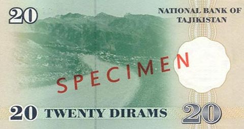 Таджикский сомони. Купюра номиналом в 20 Deram, реверс.