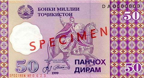 Таджикский сомони. Купюра номиналом в 50 Deram, аверс.