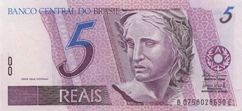 Бразильский реал. Купюра номиналом в 5 BRL, аверс.
