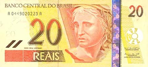 Бразильский реал. Купюра номиналом в 20 BRL, аверс.